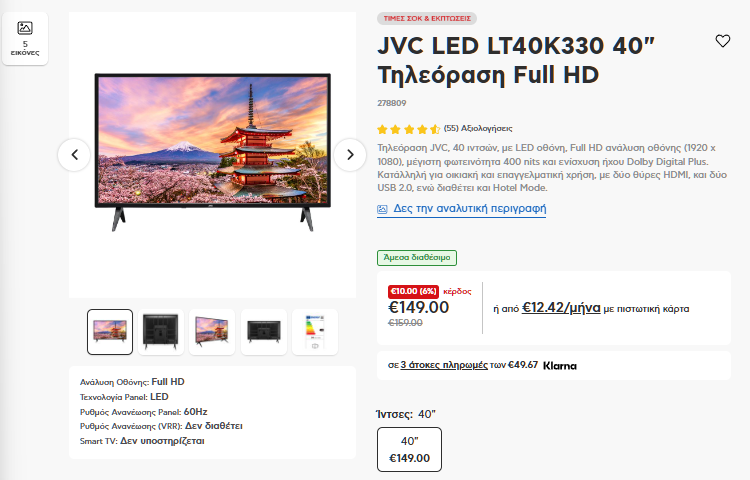 Αν θέλουμε να εξοπλίσουμε το φοιτητικό μας δωμάτιο, το γραφείο, ή το κατάστημα μας, τότε δεν χωρά αμφιβολία ότι η FHD TV της JVC στις 40″ είναι καλή ευκαιρία στα €149 τελική τιμή.
