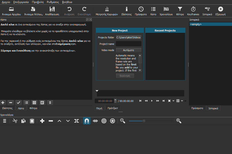 Το μεγάλο του πλεονέκτημα είναι ότι μιλάει τη γλώσσα μας. Μόλις το τρέξουμε για πρώτη φορά, αμέσως θα δούμε το εύκολο και φιλικό περιβάλλον του στα ελληνικά με οδηγίες για να ξεκινήσουμε την επεξεργασία βίντεο.