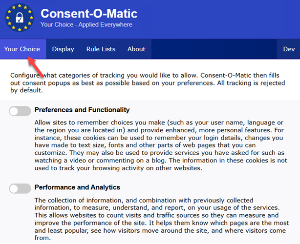 Αν αφήσουμε όλες τις επιλογές ανενεργές, το Consent-O-Matic θα κάνει ό,τι καλύτερο μπορεί για να απορρίψει κάθε cookie pop-up, διατηρώντας παράλληλα το απόρρητό μας στο μέγιστο δυνατό βαθμό.