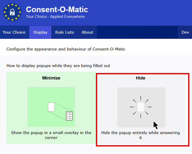 Το Consent-O-Matic είναι μια επέκταση ανοικτού κώδικα για browser που αναπτύχθηκε από ερευνητές απορρήτου στο Πανεπιστήμιο Aarhus της Δανίας και αναλαμβάνει αυτόματα τη διαχείριση των φορμών συναίνεσης για λογαριασμό μας.