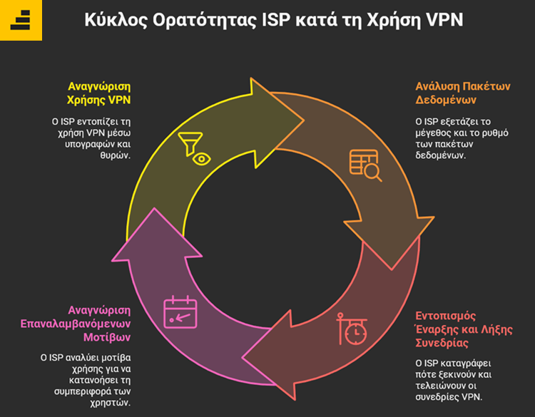 - Τα πακέτα δεδομένων μέσω VPN έχουν συχνά ομοιόμορφο μέγεθος και ρυθμό, κάτι που διαφέρει από την τυπική περιήγηση. Με τεχνικές όπως Deep Packet Inspection (DPI), ο ISP μπορεί να εντοπίσει ότι η σύνδεσή μας περνάει από VPN, ακόμη κι αν δεν βλέπει το περιεχόμενο.