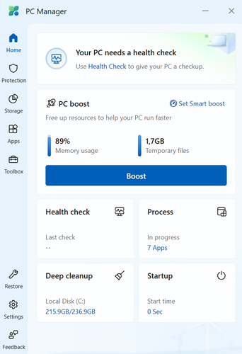 Το PC Manager είναι μια εφαρμογή που συγκεντρώνει πολλά εργαλεία συντήρησης των Windows 11 σε ένα σημείο. Αντί να ψάχνουμε σε διαφορετικά μενού για τον καθαρισμό δίσκου ή τη διαχείριση μνήμης, το συγκεκριμένο πρόγραμμα προσφέρει άμεση πρόσβαση σε αυτά.