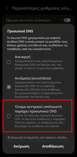 Στο πλαίσιο που θα ανοίξει, επιλέγουμε το “Όνομα κεντρικού υπολογιστή παρόχου προσωπικού DNS”.