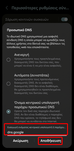 Μετά, πληκτρολογούμε το hostname ενός ασφαλούς παρόχου, όπως το “one.one.one.one” για την Cloudflare ή το “dns.google” για την Google, και πατάμε “Αποθήκευση”.