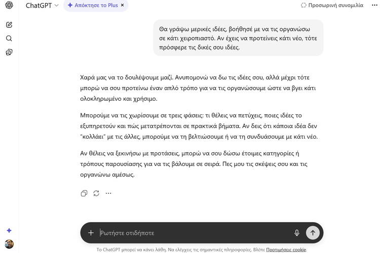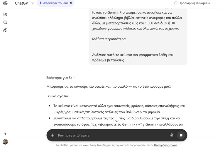 Τέλος, για να βελτιώσουμε τα γραπτά μας, παραθέτουμε το κείμενό μας και δίνουμε στο ChatGPT την προτροπή: “Ανάλυσε αυτό το κείμενο για γραμματικά λάθη και πρότεινε βελτιώσεις.”
