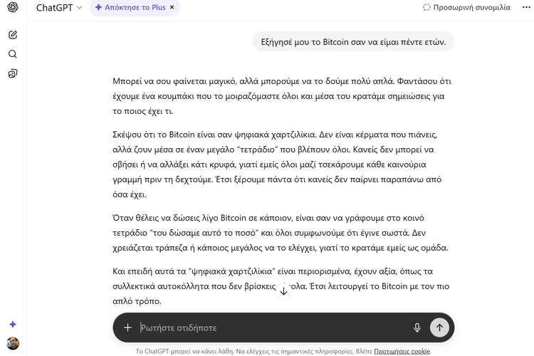 Έπειτα, αν δυσκολευόμαστε να κατανοήσουμε μια περίπλοκη έννοια, χρησιμοποιούμε την εντολή: “Εξήγησέ μου το [ΘΕΜΑ] σαν να είμαι πέντε ετών.”