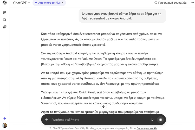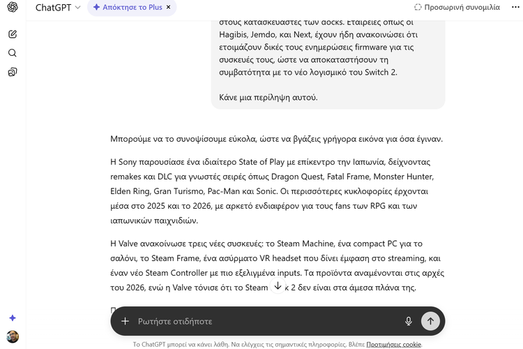 Μετά, για να γλιτώσουμε χρόνο από την ανάγνωση μεγάλων κειμένων, κάνουμε επικόλληση το κείμενο και γράφουμε: “Κάνε μια περίληψη αυτού.”