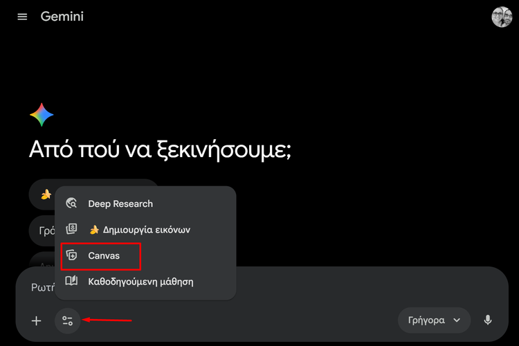 Αρχικά, ανοίγουμε το Gemini στον browser και από το μενού των εργαλείων επιλέγουμε το “Canvas”.