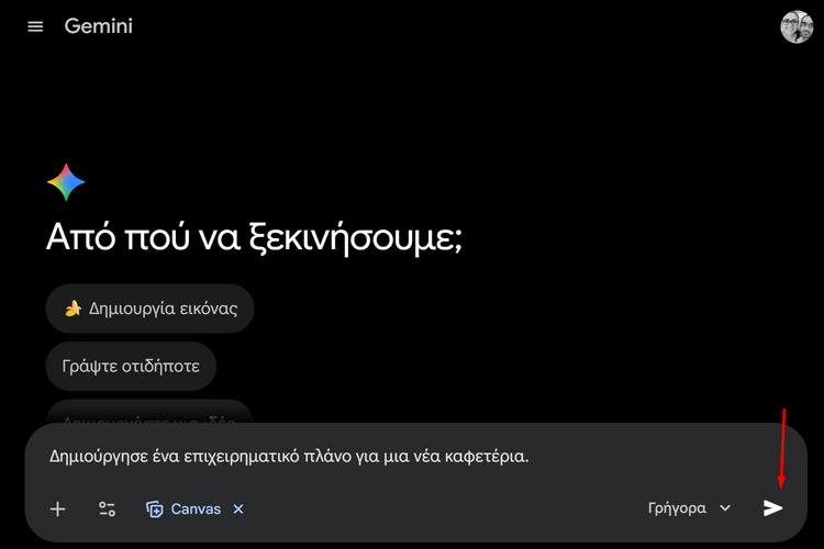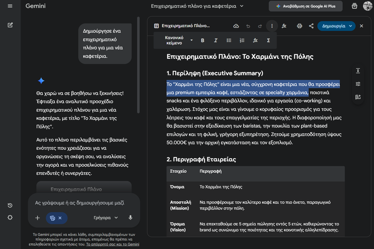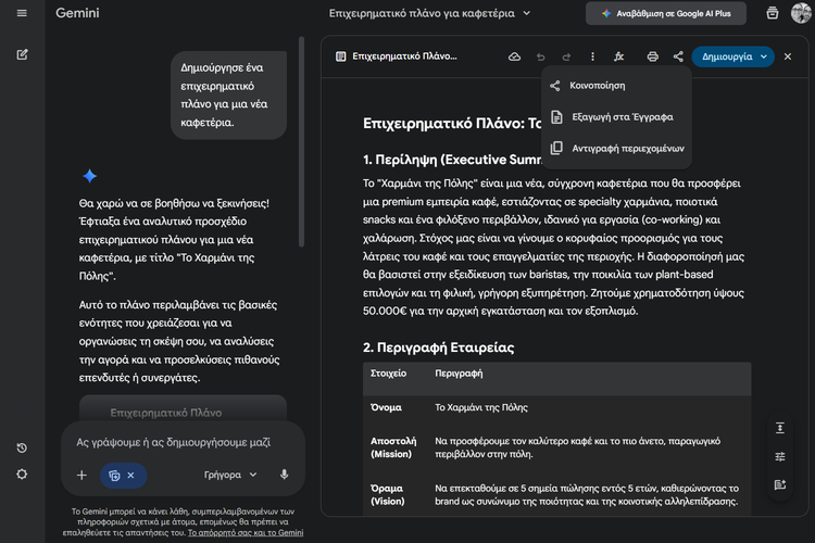 Έπειτα, πληκτρολογούμε μια προτροπή περιγράφοντας το έγγραφο που θέλουμε να δημιουργήσουμε, για παράδειγμα “Δημιούργησε ένα επιχειρηματικό πλάνο για μια νέα καφετέρια.”, και πατάμε το βέλος.
