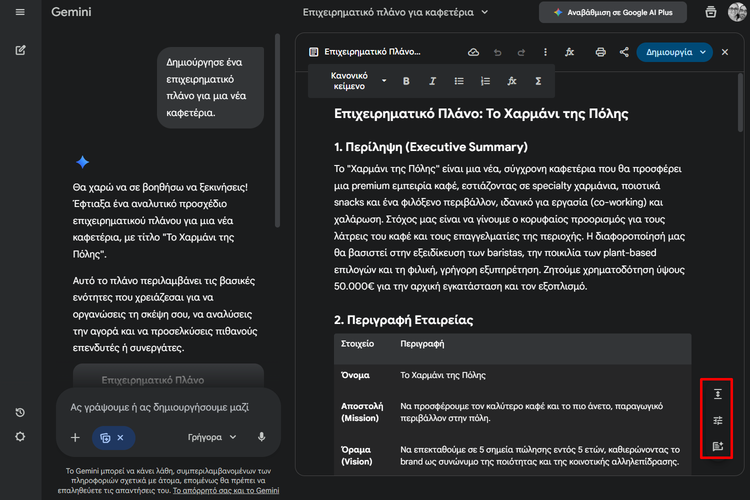 Μετά, χρησιμοποιούμε τα εικονίδια στα δεξιά του εγγράφου για να ζητήσουμε από το Gemini να αλλάξει το μήκος ή το ύφος του κειμένου.