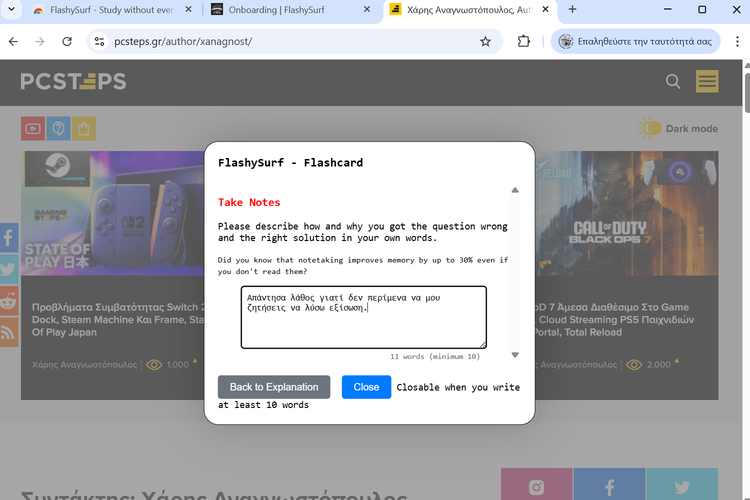 Αν κάνουμε λάθος, είμαστε υποχρεωμένοι να κρατήσουμε σημειώσεις, ώστε να κλείσει το παράθυρο. Μάλιστα, η επέκταση απαιτεί να γράψουμε τουλάχιστον 10 λέξεις, διαφορετικά το κουμπί “Close” δεν ενεργοποιείται.