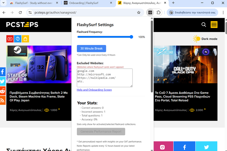Τέλος, από τις ρυθμίσεις της επέκτασης μπορούμε να ρυθμίσουμε τον ρυθμό προβολής των flashcards, να δημιουργήσουμε τις δικές μας, ή να διακόψουμε τη λειτουργία της για 30 λεπτά.