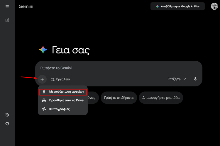 Αρχικά, ανοίγουμε το Gemini, πατάμε το “+”, επιλέγουμε “Μεταφόρτωση αρχείων”, και ανεβάζουμε την ασπρόμαυρη φωτογραφία που θέλουμε να επεξεργαστούμε.