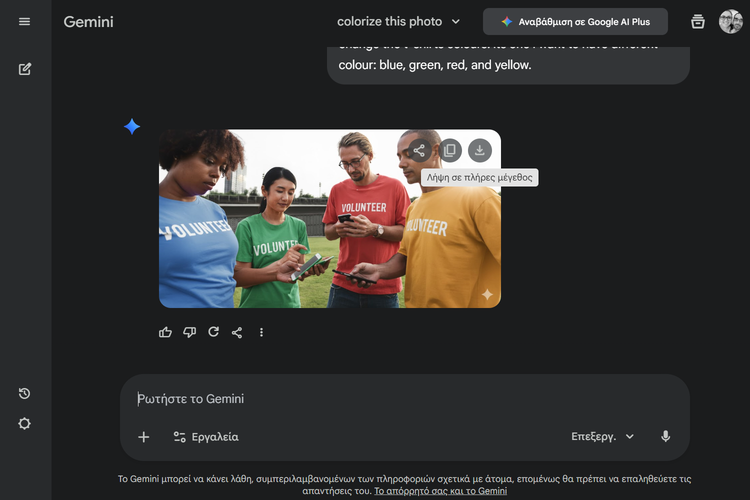 Έπειτα, μπορούμε να ζητήσουμε από το Gemini να κάνει ό,τι αλλαγές επιθυμούμε. Όταν είμαστε ικανοποιημένοι από το αποτέλεσμα, έχουμε τη δυνατότητα να κατεβάσουμε την τελική εικόνα, πατώντας το σχετικό εικονίδιο.