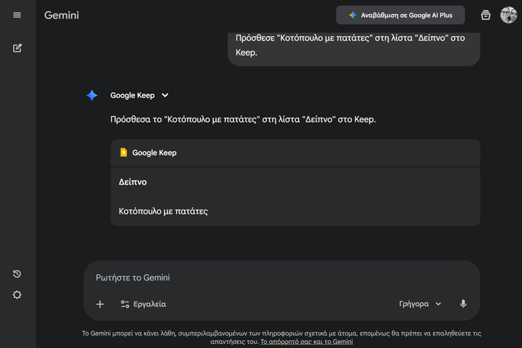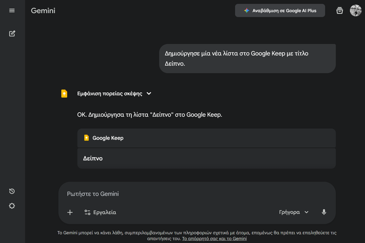 Για παράδειγμα, μπορούμε να ζητήσουμε από το Gemini να φτιάξει μια νέα λίστα γράφοντας: “Δημιούργησε μία νέα λίστα στο Google Keep.”