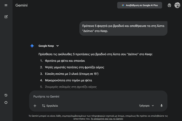 Επιπλέον, μπορούμε να ζητήσουμε από το Gemini να μας δώσει ιδέες για ένα θέμα και να τις αποθηκεύσει απευθείας στο Keep: “Πρότεινε 5 φαγητά για βραδινό και αποθήκευσε τα στο Keep.”