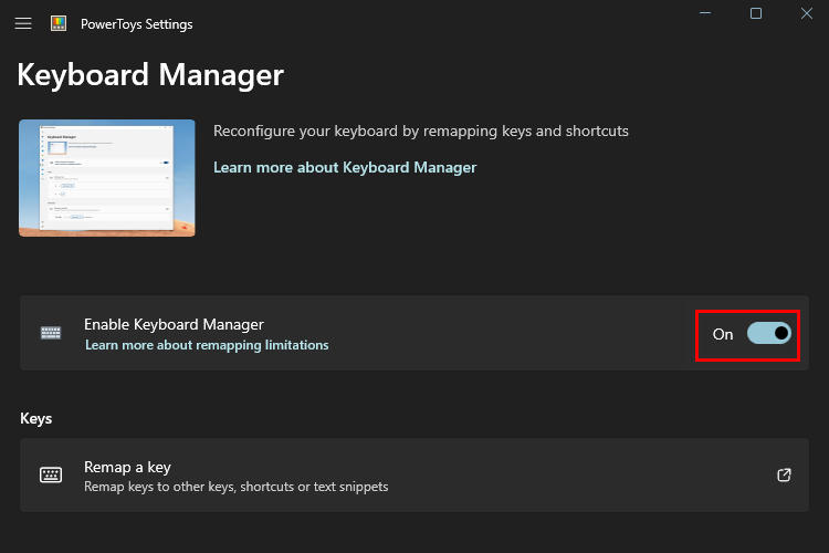 Έπειτα, ενεργοποιούμε τον διακόπτη δίπλα στο “Enable Keyboard Manager”.