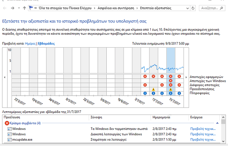 Όταν κολλάνε τα Windows, η εποπτεία αξιοπιστίας καταγράφει τον λόγο που το προκάλεσε, απεικονίζοντας την αστοχία με ένα “X” μέσα σε κόκκινο κύκλο, όπως παρατηρούμε στις φωτογραφίες.