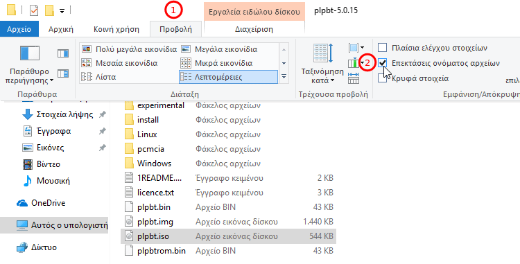 Θα χρειαστεί να γράψουμε το .iso σε CD. Για να ξεχωρίσουμε τα αρχεία, μπορούμε να εμφανίσουμε τις επεκτάσεις αρχείων, κάνοντας κλικ στην προβολή και τσεκάροντας την επιλογή “Επεκτάσεις ονόματος αρχείων”.