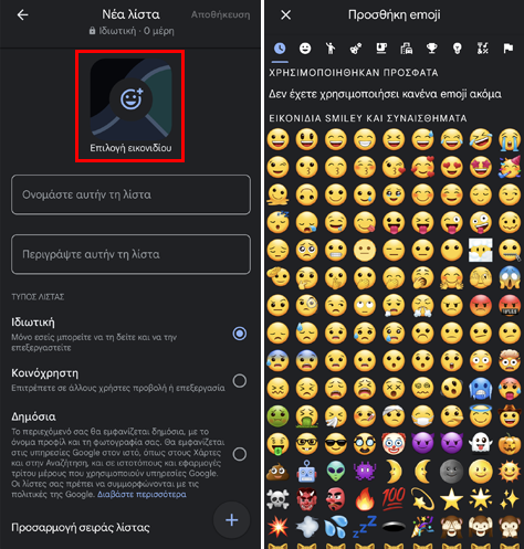 Εκτός από τις προεπιλεγμένες λίστες, η Google επιτρέπει να δημιουργούμε τις δικές μας λίστες. Μάλιστα, προσφέρει τη δυνατότητα να χρησιμοποιούμε emoji ως εικονίδια για τις τοποθεσίες που προσθέτουμε σε αυτές τις λίστες.