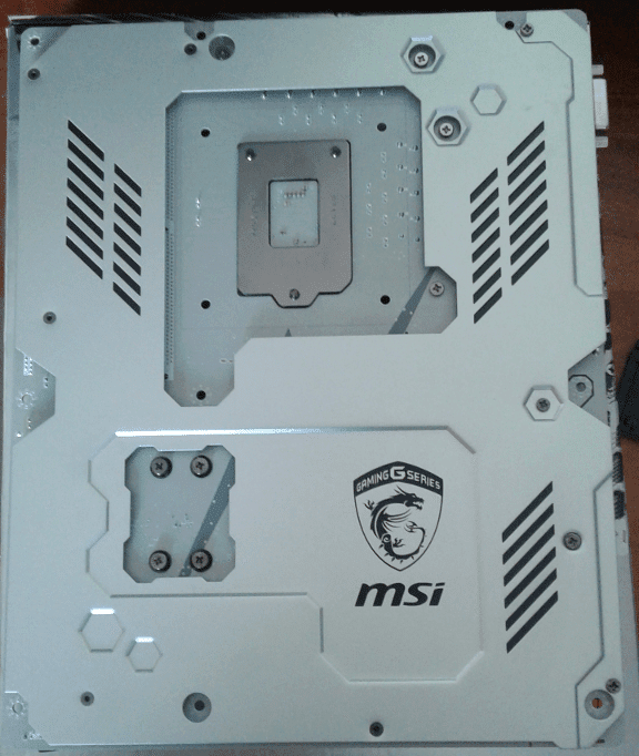 Η πίσω πλευρά είναι καλυμμένη από μια επιπλέον προστατευτική πλάκα. Αφήνει κενά μόνο για την εγκατάσταση aftermarket ψύκτρας ή την αντικατάσταση της παθητικής ψύκτρας για το chipset.