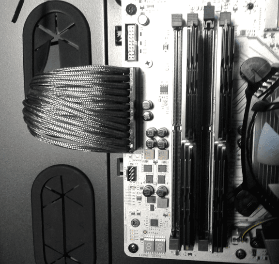 Έχει επίσης γίνει η σύνδεση της μητρικής με το τροφοδοτικό, με τις δύο σχετικές θύρες, χρησιμοποιώντας τα sleeved καλώδια.