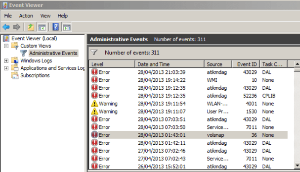 Στη συνέχεια, για του λόγου το αληθές, δίνει οδηγίες στο χρήστη πώς να ανοίξει τον event viewer και την ενότητα Administrative Events, η οποία είναι γεμάτη Errors και Warnings.