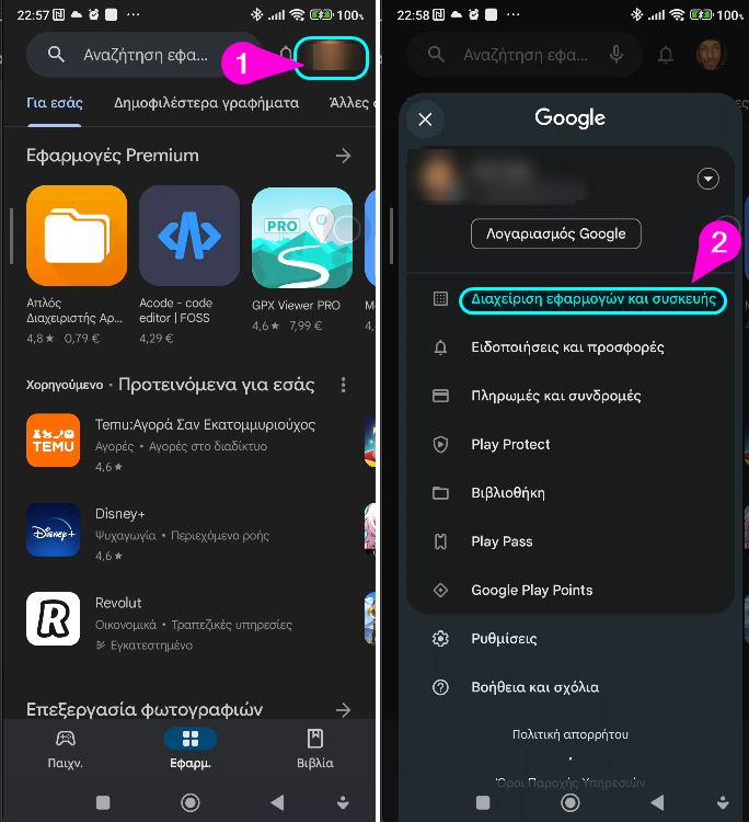 Αρχικά, ανοίγουμε το Play Store στη συσκευή Android και πατάμε το εικονίδιο του προφίλ μας επάνω δεξιά. Στη συνέχεια, επιλέγουμε “Διαχείριση εφαρμογών και συσκευής” από το μενού.