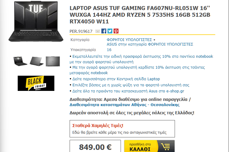 Το ASUS είναι εξοπλισμένο με AMD Ryzen 5-7535HS, NVIDIA GeForce RTX 4050, οθόνη FHD 144Hz, 16GB RAM, 512GB SSD, και Windows 11 Home.