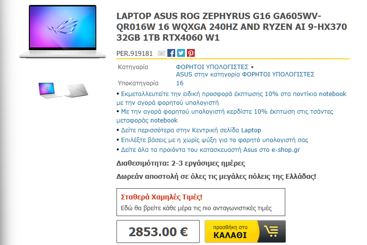 Το ASUS ROG ZEPHYRUS G16, έρχεται με οθόνη OLED 16 ιντσών στα 240Hz, 32GB DDR5 μνήμη στα 7500 MHz, και την RTX 4078. Διαθέτει τον Ryzen 9 AI HX370, SSD 1TB, βάρος1,85 kg, και τρέχει τα Windows 11.