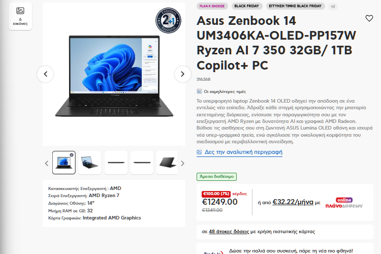 Το Asus Zenbook έρχεται με οθόνη OLED 16 ιντσών στα 120Hz, και είναι εξοπλισμένο με τον δυνατό Ryzen 7 AI 350, 32GB RAM και 1TB SSD.