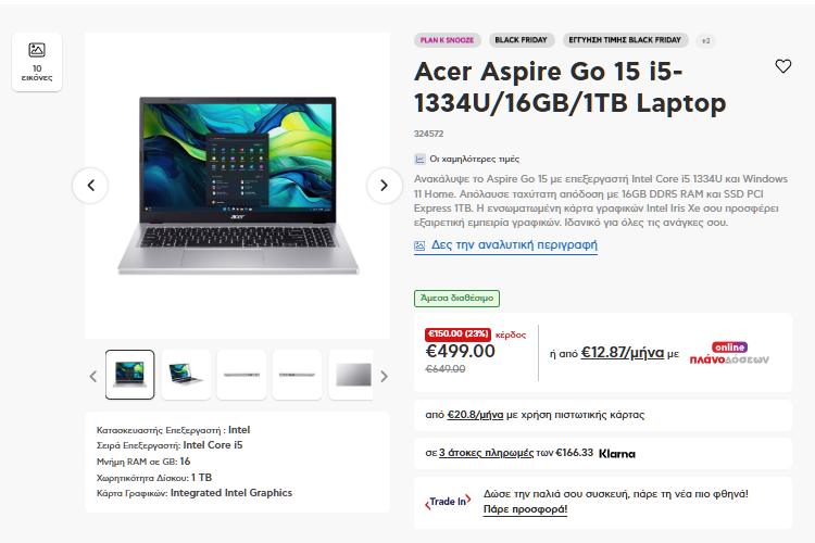 Το Acer έρχεται με τον Intel Core i5-1334U, μνήμη RAM 16GB, 1TB SSD, και Windows 11 Home.