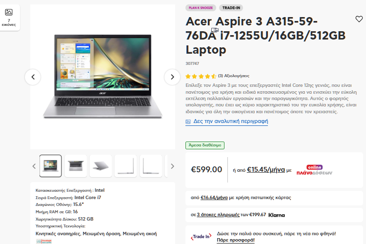 Το Acer έρχεται με τον Intel Core i5-1235U, μνήμη RAM 8GB, 512GB SSD, και Windows 11 Home.
