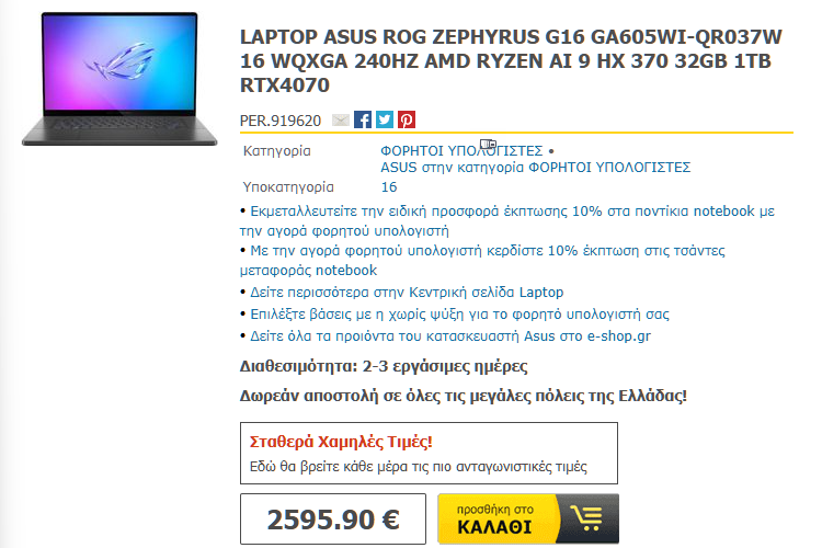 Το ASUS ROG ZEPHYRUS G16, έρχεται με οθόνη WQXGA 16 ιντσών, 32GB DDR5 μνήμη στα 7500 MHz, και την RTX 4060. Διαθέτει τον Ryzen 9 AI HX370, SSD 1TB, βάρος1,85 kg, και τρέχει τα Windows 11.