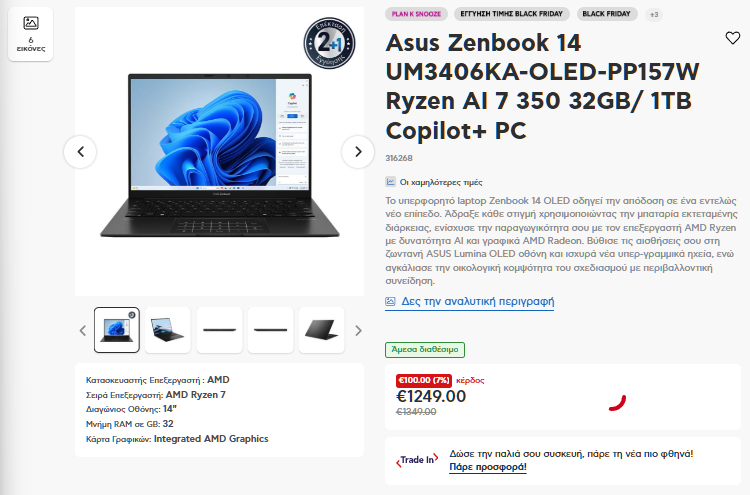 €1.249 Asus Zenbook, Ryzen AI 7 350 / 32GB / 1TB SSD / 14″ OLED, Win11