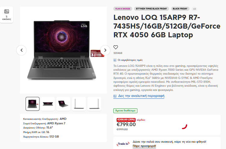 Το Lenovo LOQ είναι εξοπλισμένο με AMD Ryzen 7-7435HS, NVIDIA GeForce RTX 4050, οθόνη FHD 144Hz, 16GB RAM, 512GB SSD, και Windows 11 Home.