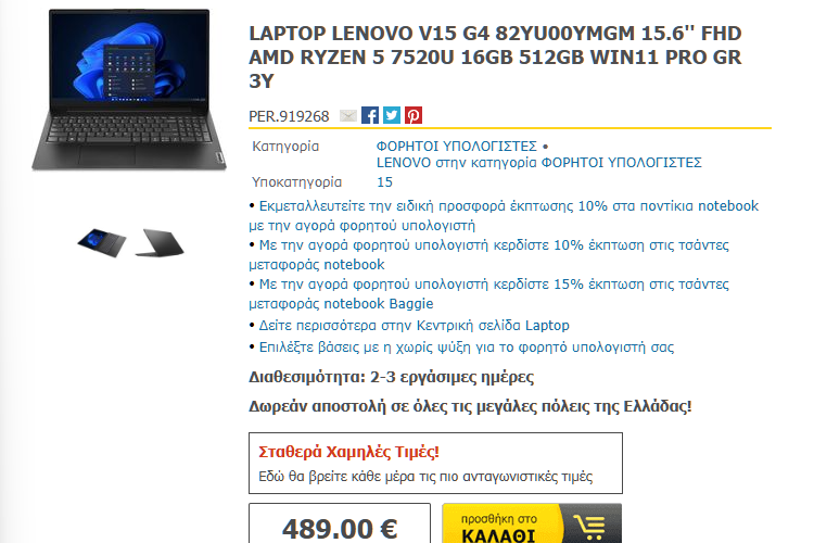 Το Lenovo διαθέτει FHD οθόνη 15.6″, τον Ryzen 5-7520U 16GB DDR5 μνήμη RAM, 512GB SSD, και χαμηλό βάρος στα 1,61 kg.