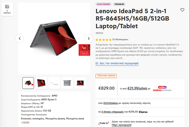 €829,00 IdeaPad 2 σε 1, R5-8645HS / 16GB / 512GB, 14″OLED Αφής FHD+, Win 11