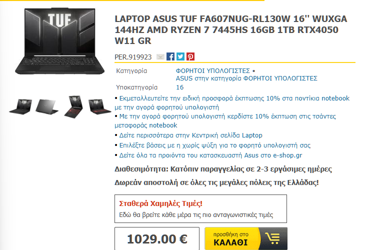 Το ASUS είναι εξοπλισμένο με AMD Ryzen 7-7445HS, NVIDIA GeForce RTX 4050, οθόνη 16″ FHD 144Hz, 16GB RAM, 1TB SSD, και Windows 11 Home.