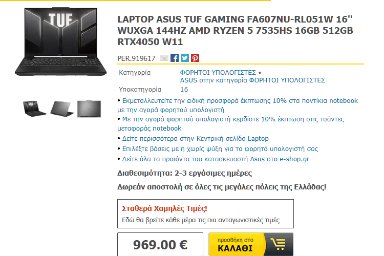 Το ASUS είναι εξοπλισμένο με AMD Ryzen 5-7535HS, NVIDIA GeForce RTX 4050, οθόνη 16″ FHD 144Hz, 16GB RAM, 512GB SSD, και Windows 11 Home.