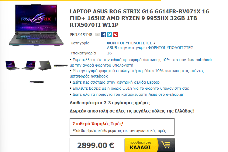 To Asus Rog έρχεται με τον Ryzen 9-9955HX και την RTX 5070Ti. Επίσης, διαθέτει οθόνη 16” FHD+ στα 165Hz, μνήμη RAM DDR5 32GB, και 1TB SSD. Έχει προεγκατεστημένα τα Windows 11.