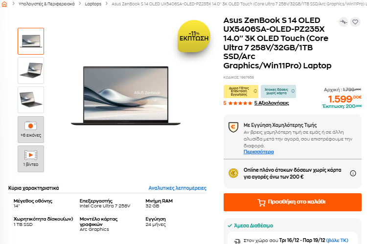 Το Asus Zenbook έρχεται με οθόνη OLED αφής στα 120Hz, και είναι εξοπλισμένο με τον επεξεργαστή Intel Ultra 7-258V, 32GB RAM, και δίσκο 1TB SSD.