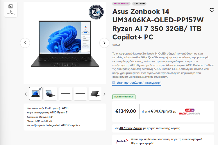 Το μεταλλικό Asus Zenbook είναι ισχυρό ΑΙ Copilot+ PC με οθόνη OLED, εξοπλισμένο με τον Ryzen AI 7 350 με NPU, 32GB RAM, και δίσκο 1TB SSD.