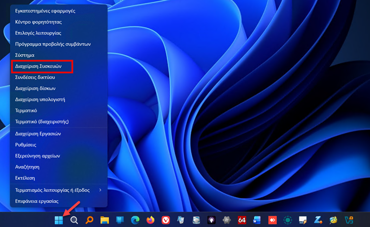 Με δεξί κλικ στο κουμπί Έναρξη ανοίγουμε τη Διαχείριση Συσκευών.