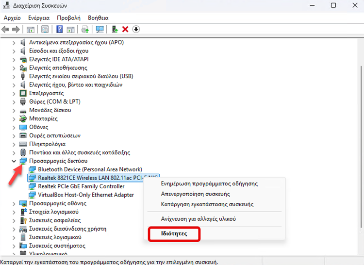 Στη συνέχεια εντοπίζουμε το μενού Προσαρμογείς δικτύου. Βρίσκουμε την κάρτα δικτύου Wi-Fi και, με δεξί κλικ, ανοίγουμε τις Ιδιότητες.