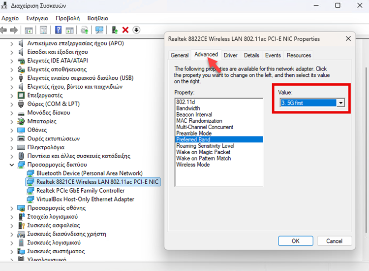 Μεταβαίνουμε στην καρτέλα Για προχωρημένους (Advanced), εντοπίζουμε την επιλογή Προτιμώμενη μπάντα (Preferred Band) και επιλέγουμε Προτίμηση μπάντας 5GHz, έπειτα πατάμε OK.