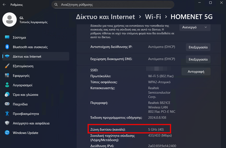 Αν η πληροφορία δεν εμφανίζεται άμεσα, κάνουμε κλικ στις Ιδιότητες και εντοπίζουμε το πεδίο Ζώνη δικτύου, όπου φαίνεται ποια ζώνη Wi-Fi είναι ενεργή.