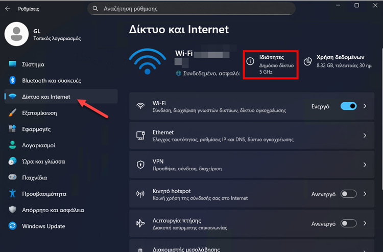 Στη συνέχεια κάνουμε κλικ στο Δίκτυο και Internet. Στην ενότητα Ιδιότητες, στο επάνω μέρος της σελίδας, μπορούμε να δούμε αν είμαστε συνδεδεμένοι σε δίκτυο 5GHz ή 2.4GHz.