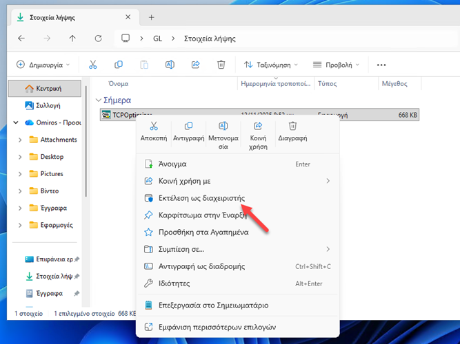 Αφού το κατεβάσουμε, θα δούμε στον φάκελο των λήψεων το αρχείο TCPOptimizer.exe.