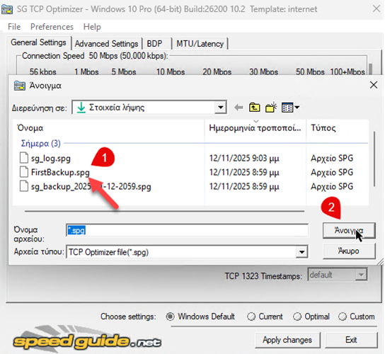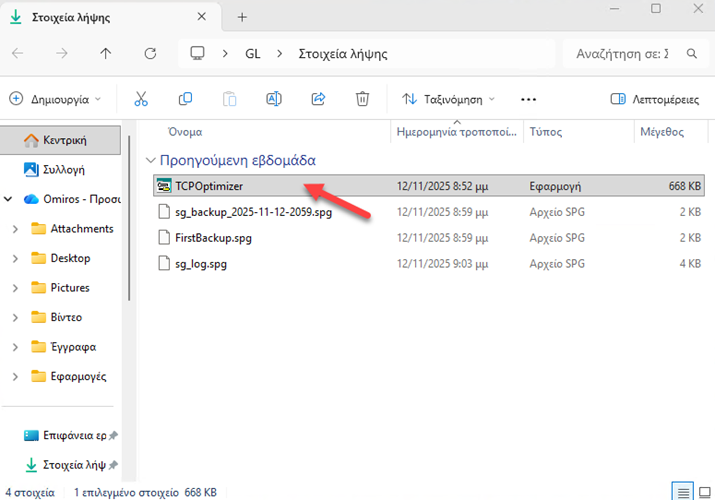 Τα αντίγραφα ασφαλείας αποθηκεύονται με τη μορφή αρχείων .spg στην τοποθεσία από όπου εκτελέσαμε το TCPOptimizer. Στην περίπτωσή μας είναι ο φάκελος με τις λήψεις.